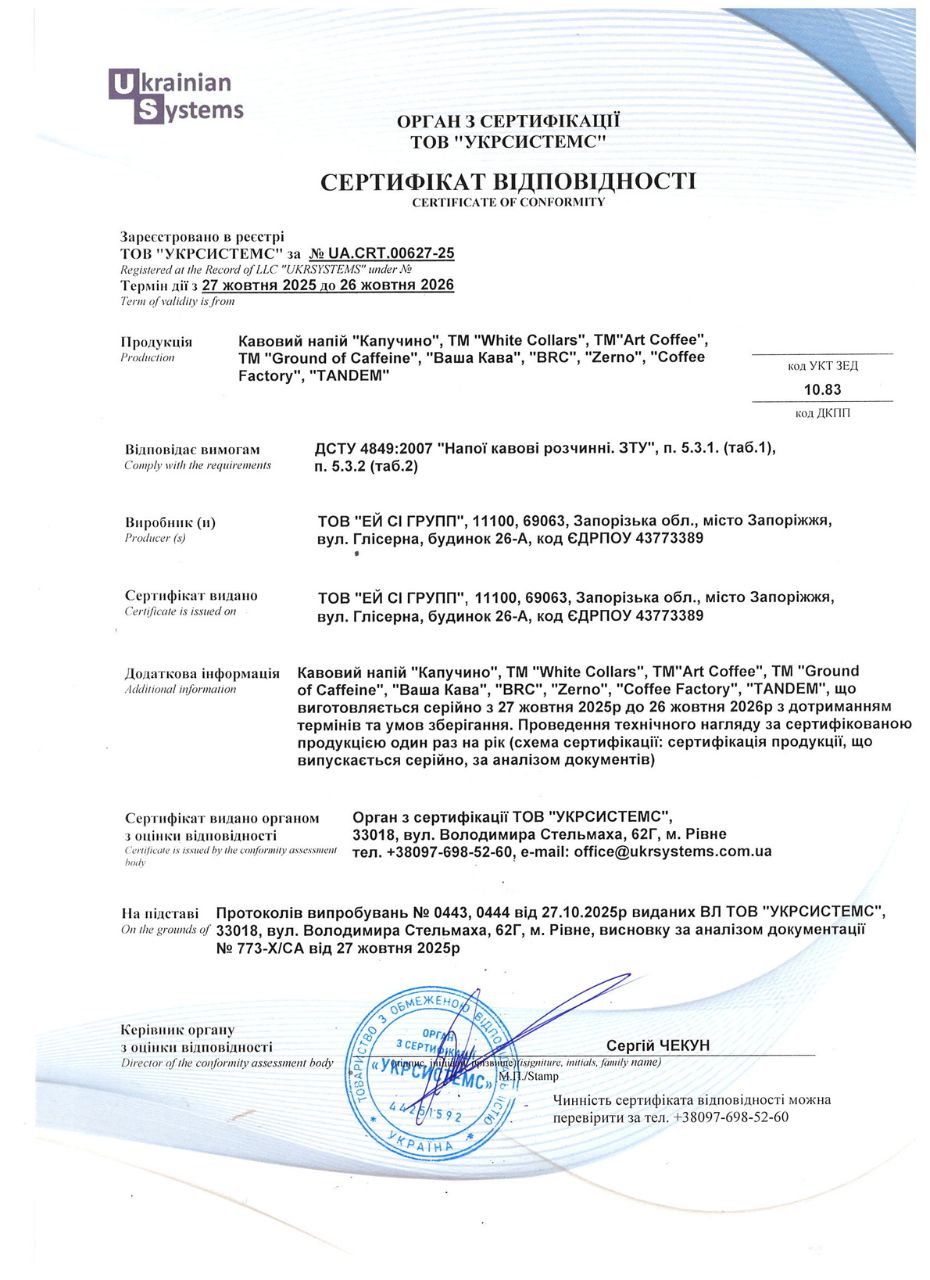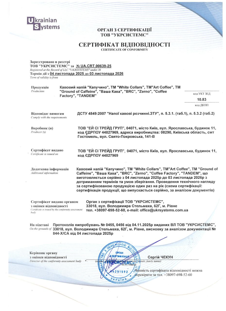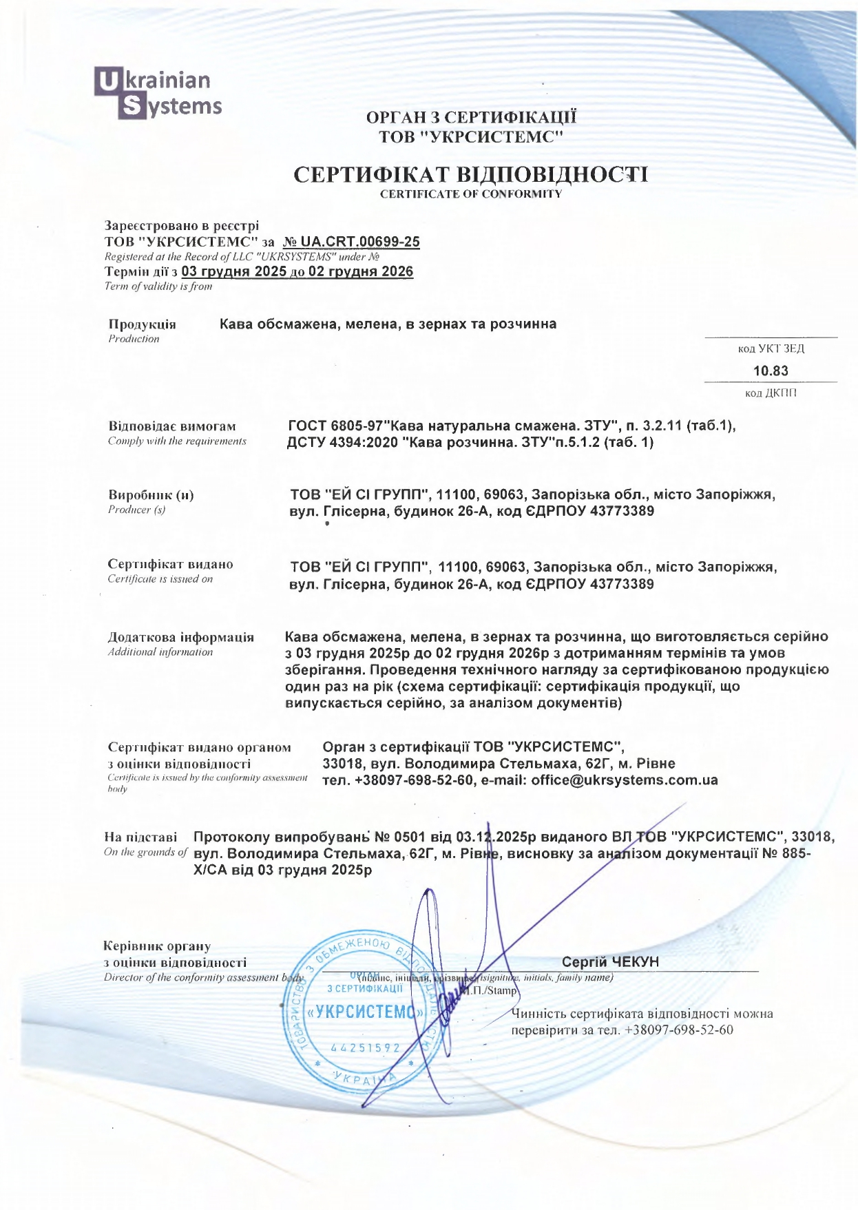 Обсмажування кави - це творчий процес, але навіть в мистецтві існують свої правила. Ми виробляємо каву відповідно до ГОСТ 6805-97 і контролюємо якість на всіх етапах: від вибору сировини до фасування.